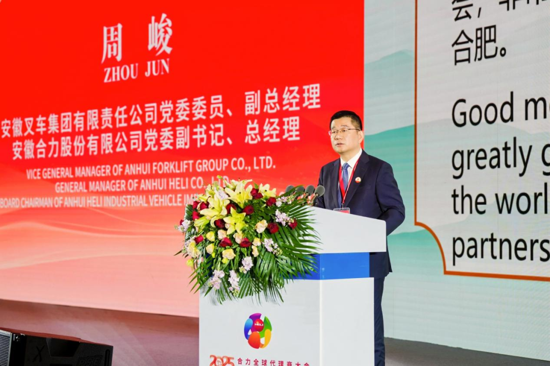 楊安國致歡迎辭,代表公司對各位新老朋友的到來表示誠摯的歡迎和感謝。他表示,合力的發(fā)展深深植根于江淮沃土,在合作伙伴的共同努力下,連續(xù)34年蟬聯(lián)中國工業(yè)車輛行業(yè)榜首,預(yù)計今年營業(yè)收入將突破200億元,較首屆代理商大會時實現(xiàn)翻番;海外業(yè)務(wù)營收預(yù)計超80億元,增長近5倍。目前,合力全球代理商網(wǎng)絡(luò)已擴展至400余家,業(yè)務(wù)遍及180多個國家和地區(qū),在34個海外市場中占有率位列第一。當(dāng)前合力已建成覆蓋歐洲、北美、東南亞等地的八大海外中心,設(shè)立首個海外研發(fā)中心與海外制造基地,構(gòu)建了“全球研發(fā)+本地制造+區(qū)域服務(wù)”的一體化運營模式。面向未來,合力將堅持創(chuàng)新驅(qū)動,推進“電動化+智能化”雙輪驅(qū)動戰(zhàn)略,加快綠色轉(zhuǎn)型,構(gòu)建ESG戰(zhàn)略體系,深化開放合作,與全球伙伴共建發(fā)展共同體,開創(chuàng)合作共贏新局面。