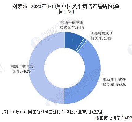 叉車(chē)主要分為四類(lèi),包括內(nèi)燃平衡重式叉車(chē)、電動(dòng)平衡重叉車(chē)、電動(dòng)乘駕式倉(cāng)儲(chǔ)叉車(chē)、電動(dòng)步行式倉(cāng)儲(chǔ)叉車(chē),分別對(duì)應(yīng)歐美分類(lèi)標(biāo)準(zhǔn)的IV/V、I、 II、III類(lèi)叉車(chē)。從2020年1-11月份的銷(xiāo)售結(jié)構(gòu)來(lái)看,內(nèi)燃平衡重式叉車(chē)和電動(dòng)步行式倉(cāng)儲(chǔ)叉車(chē)占比最高,分別為49.7%和39.5%。