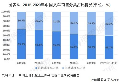 2020年1-11月份的累計(jì)銷(xiāo)量達(dá)到72.56萬(wàn)輛,與2019年同期相比增長(zhǎng)30.3%,其中電動(dòng)式叉車(chē)銷(xiāo)量占比達(dá)到50.3%,比2019年增長(zhǎng)1.2個(gè)百分點(diǎn),主要是受環(huán)保要求和室內(nèi)作業(yè)環(huán)境要求的驅(qū)動(dòng),電動(dòng)叉車(chē)需求持續(xù)增長(zhǎng)。