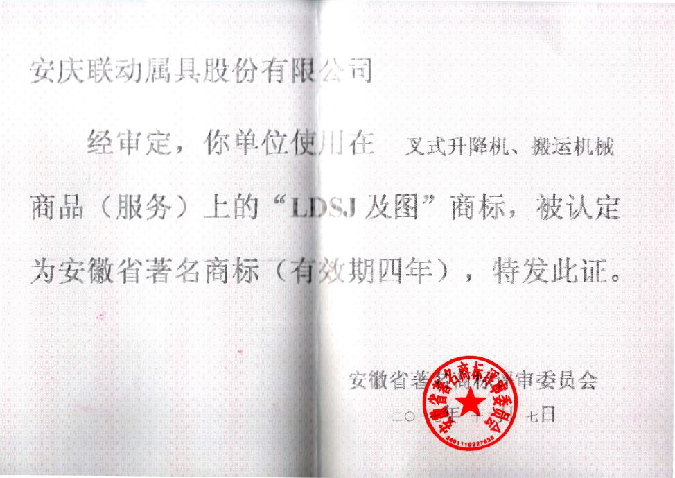 安徽省著名商標(biāo)證書